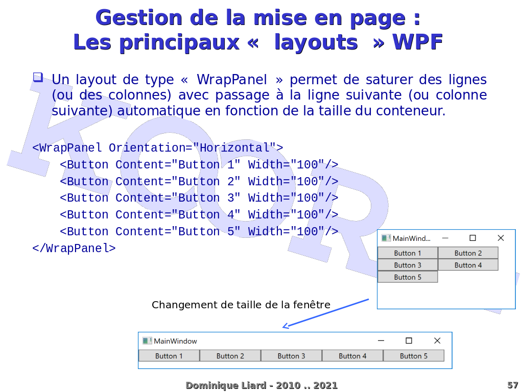 Gestion de la mise en page : Les principaux « layouts » WPF Un layout de type « WrapPanel » permet de saturer des lignes (ou des colonnes) avec passage à la ligne suivante (ou colonne suivante) automatique en fonction de la taille du conteneur. <WrapPanel Orientation="Horizontal"> <Button Content="Button 1" Width="100"/> <Button Content="Button 2" Width="100"/> <Button Content="Button 3" Width="100"/> <Button Content="Button 4" Width="100"/> <Button Content="Button 5" Width="100"/> </WrapPanel> Dominique Liard - 2010 .. 2021 Changement de taille de la fenêtre