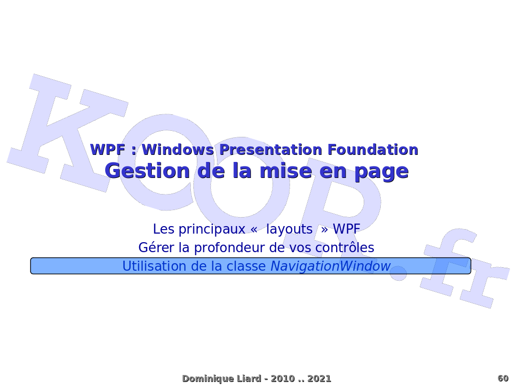 WPF : Windows Presentation Foundation Gestion de la mise en page Les principaux « layouts » WPF Gérer la profondeur de vos contrôles Utilisation de la classe NavigationWindow Dominique Liard - 2010 .. 2021