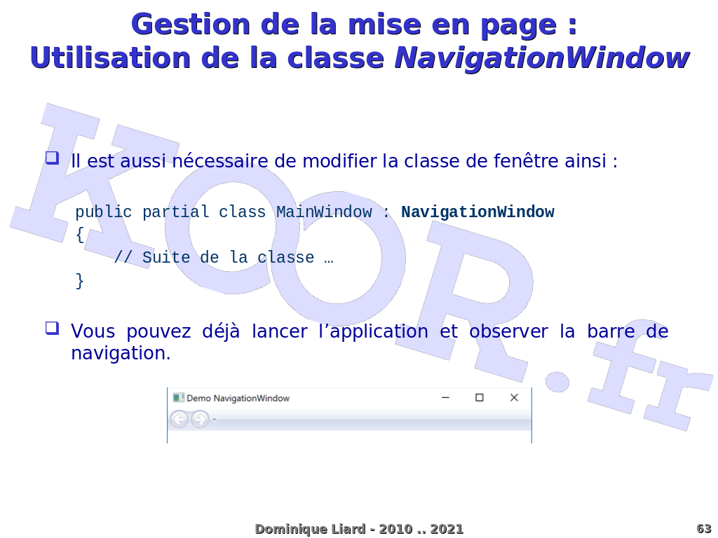 Gestion de la mise en page : Utilisation de la classe NavigationWindow Il est aussi nécessaire de modifier la classe de fenêtre ainsi : public partial class MainWindow : NavigationWindow { // Suite de la classe ? } Vous pouvez déjà lancer l'application et observer la barre de navigation. Dominique Liard - 2010 .. 2021