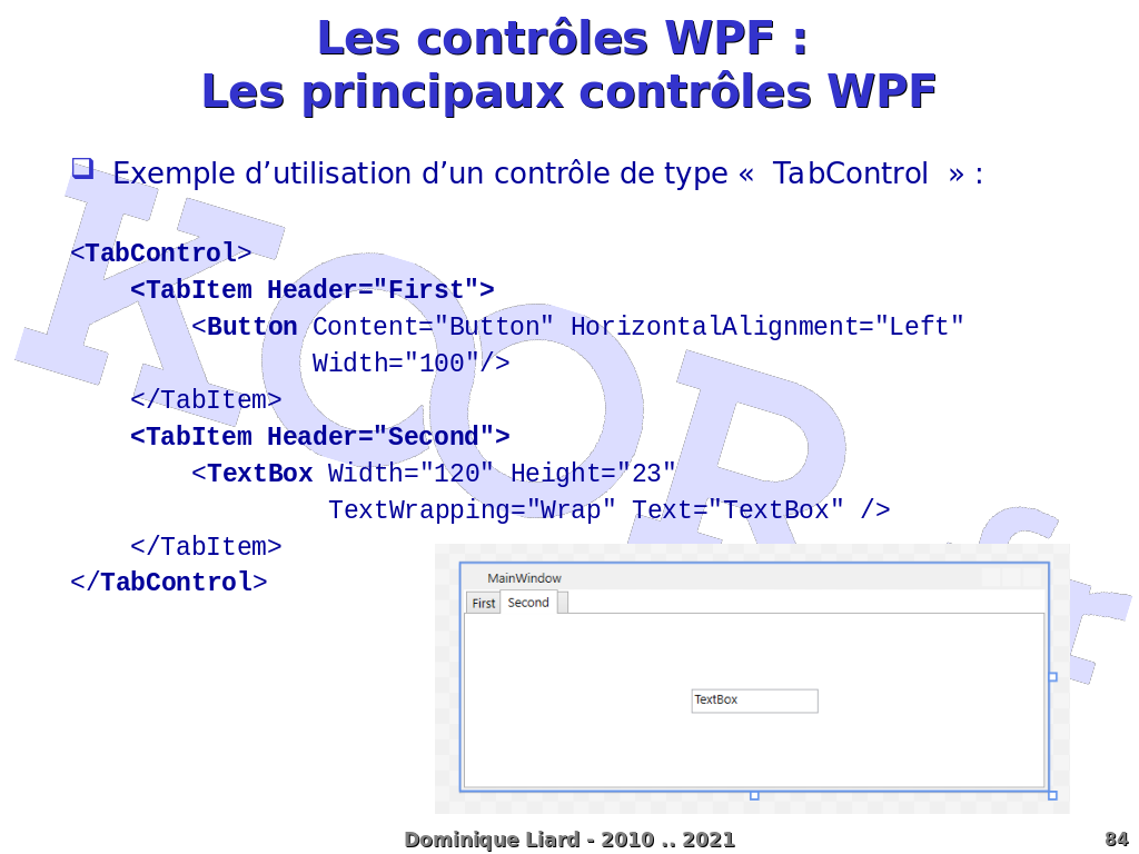 Les contrôles WPF : Les principaux contrôles WPF Exemple d'utilisation d'un contrôle de type « TabControl » : <TabControl> <TabItem Header="First"> <Button Content="Button" HorizontalAlignment="Left" Width="100"/> </TabItem> <TabItem Header="Second"> <TextBox Width="120" Height="23" TextWrapping="Wrap" Text="TextBox" /> </TabItem> </TabControl> Dominique Liard - 2010 .. 2021