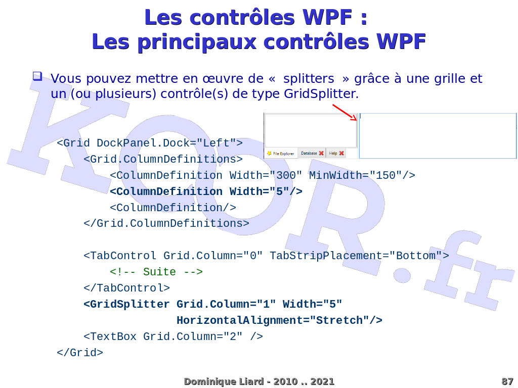 Les contrôles WPF : Les principaux contrôles WPF Vous pouvez mettre en ?uvre de « splitters » grâce à une grille et un (ou plusieurs) contrôle(s) de type GridSplitter. <Grid DockPanel.Dock="Left"> <Grid.ColumnDefinitions> <ColumnDefinition Width="300" MinWidth="150"/> <ColumnDefinition Width="5"/> <ColumnDefinition/> </Grid.ColumnDefinitions> <TabControl Grid.Column="0" TabStripPlacement="Bottom"> <!-- Suite --> </TabControl> <GridSplitter Grid.Column="1" Width="5" HorizontalAlignment="Stretch"/> <TextBox Grid.Column="2" /> </Grid> Dominique Liard - 2010 .. 2021