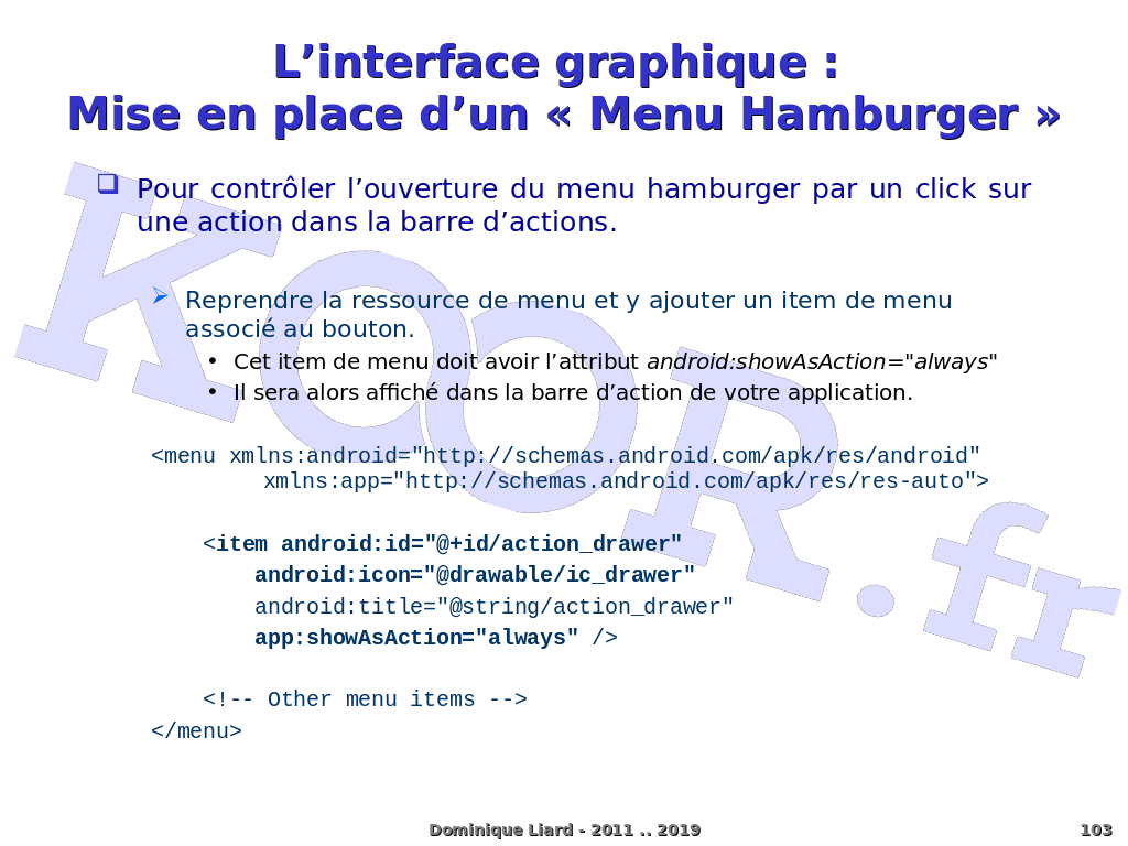 L?interface graphique : Mise en place d?un « Menu Hamburger » Pour contrôler l?ouverture du menu hamburger par un click sur une action dans la barre d?actions. Reprendre la ressource de menu et y ajouter un item de menu associé au bouton. Cet item de menu doit avoir l?attribut android:showAsAction="always" Il sera alors affiché dans la barre d?action de votre application. <menu xmlns:android="http://schemas.android.com/apk/res/android" xmlns:app="http://schemas.android.com/apk/res/res-auto"> <item android:id="@+id/action_drawer" android:icon="@drawable/ic_drawer" android:title="@string/action_drawer" app:showAsAction="always" /> <!-- Other menu items --> </menu> Dominique Liard - 2011 .. 2019