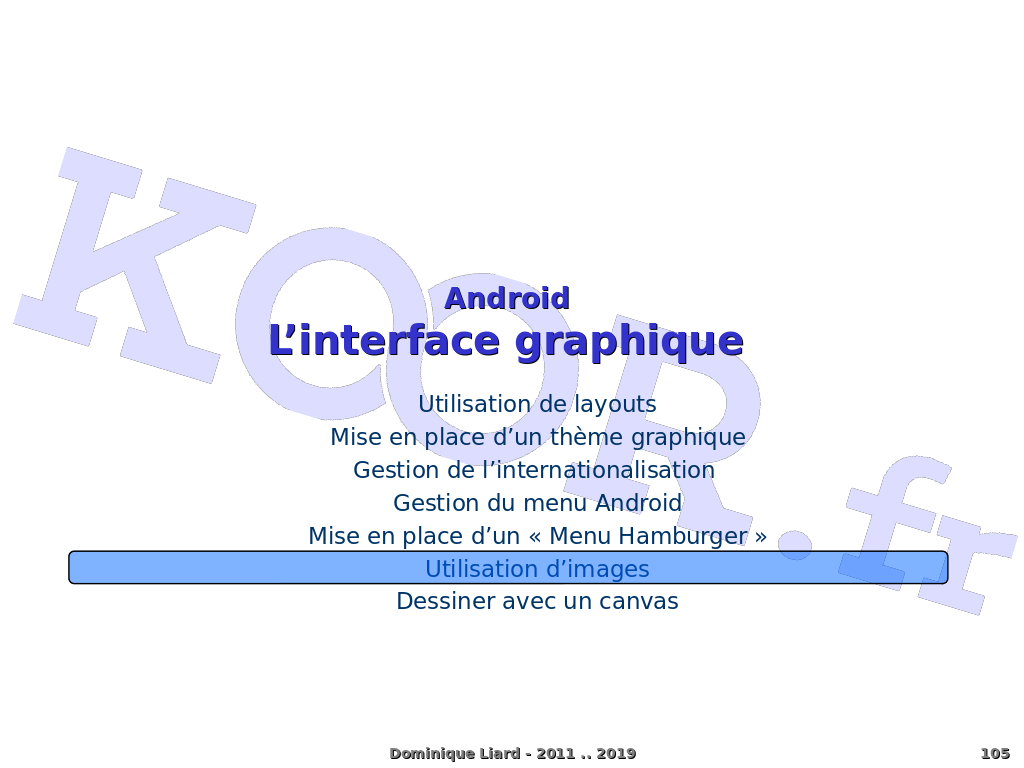 Android L?interface graphique Utilisation de layouts Mise en place d?un thème graphique Gestion de l?internationalisation Gestion du menu Android Mise en place d?un « Menu Hamburger » Utilisation d?images Dessiner avec un canvas Dominique Liard - 2011 .. 2019