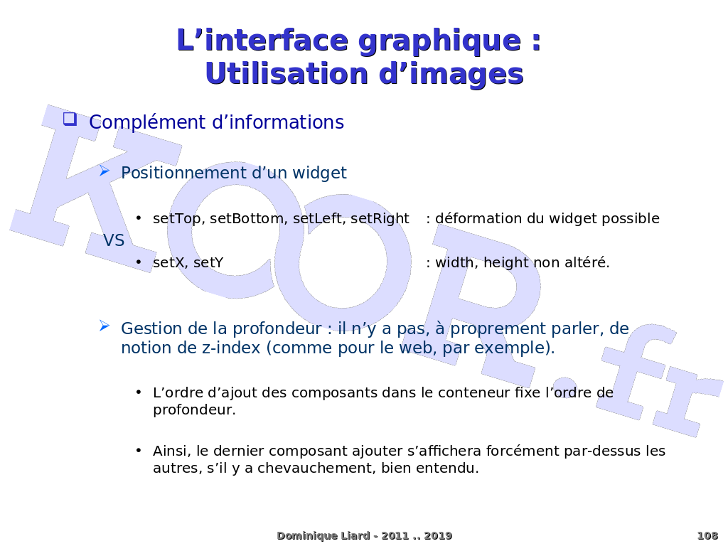 L?interface graphique : Utilisation d?images Complément d?informations Positionnement d?un widget setTop, setBottom, setLeft, setRight : déformation du widget possible VS setX, setY : width, height non altéré. Gestion de la profondeur : il n?y a pas, à proprement parler, de notion de z-index (comme pour le web, par exemple). L?ordre d?ajout des composants dans le conteneur fixe l?ordre de profondeur. Ainsi, le dernier composant ajouter s?affichera forcément par-dessus les autres, s?il y a chevauchement, bien entendu. Dominique Liard - 2011 .. 2019