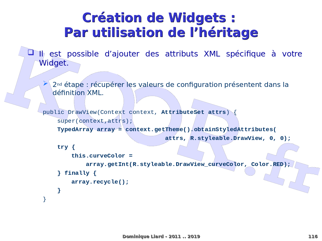 Création de Widgets : Par utilisation de l?héritage Il est possible d?ajouter des attributs XML spécifique à votre Widget. 2nd étape : récupérer les valeurs de configuration présentent dans la définition XML. public DrawView(Context context, AttributeSet attrs) { super(context,attrs); TypedArray array = context.getTheme().obtainStyledAttributes( attrs, R.styleable.DrawView, 0, 0); try { this.curveColor = array.getInt(R.styleable.DrawView_curveColor, Color.RED); } finally { array.recycle(); } } Dominique Liard - 2011 .. 2019