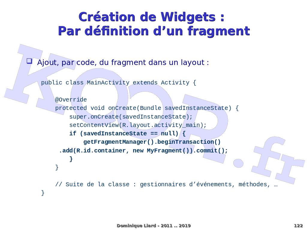Création de Widgets : Par définition d?un fragment Ajout, par code, du fragment dans un layout : public class MainActivity extends Activity { @Override protected void onCreate(Bundle savedInstanceState) { super.onCreate(savedInstanceState); setContentView(R.layout.activity_main); if (savedInstanceState == null) { getFragmentManager().beginTransaction() .add(R.id.container, new MyFragment()).commit(); } } // Suite de la classe : gestionnaires d?événements, méthodes, ? } Dominique Liard - 2011 .. 2019