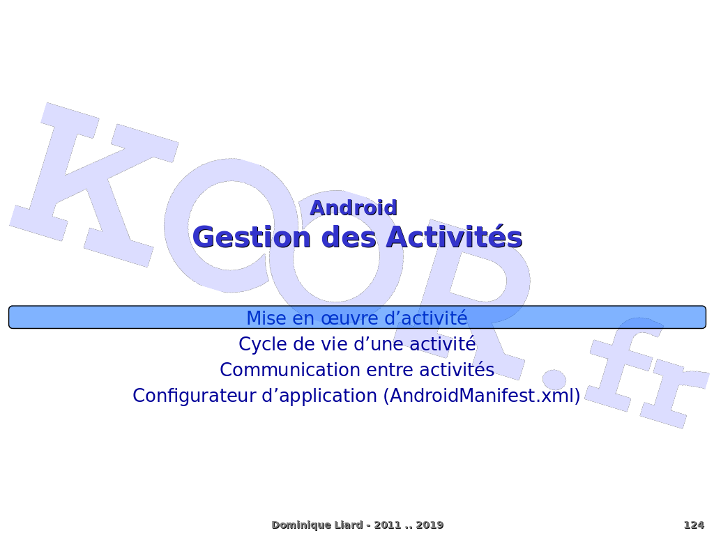Android Gestion des Activités Mise en ?uvre d?activité Cycle de vie d?une activité Communication entre activités Configurateur d?application (AndroidManifest.xml) Dominique Liard - 2011 .. 2019