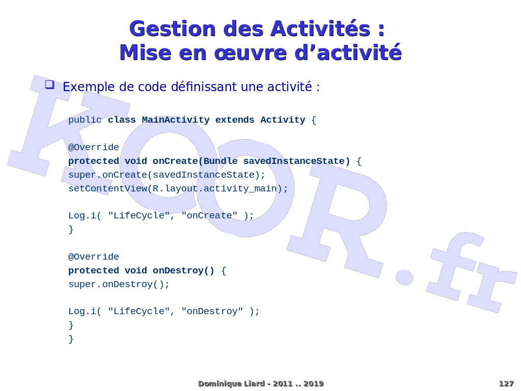 Gestion des Activités : Mise en ?uvre d?activité Exemple de code définissant une activité : public class MainActivity extends Activity { @Override protected void onCreate(Bundle savedInstanceState) { super.onCreate(savedInstanceState); setContentView(R.layout.activity_main); Log.i( "LifeCycle", "onCreate" ); } @Override protected void onDestroy() { super.onDestroy(); Log.i( "LifeCycle", "onDestroy" ); } } Dominique Liard - 2011 .. 2019