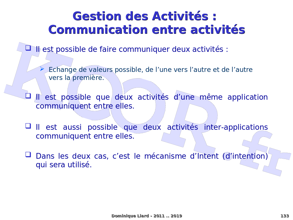 Gestion des Activités : Communication entre activités Il est possible de faire communiquer deux activités : Echange de valeurs possible, de l?une vers l?autre et de l?autre vers la première. Il est possible que deux activités d?une même application communiquent entre elles. Il est aussi possible que deux activités inter-applications communiquent entre elles. Dans les deux cas, c?est le mécanisme d?Intent (d?intention) qui sera utilisé. Dominique Liard - 2011 .. 2019