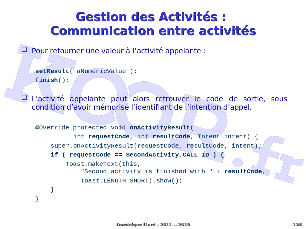 Gestion des Activités : Communication entre activités Pour retourner une valeur à l?activité appelante : setResult( aNumericValue ); finish(); L?activité appelante peut alors retrouver le code de sortie, sous condition d?avoir mémorisé l?identifiant de l?intention d?appel. @Override protected void onActivityResult( int requestCode, int resultCode, Intent intent) { super.onActivityResult(requestCode, resultCode, intent); if ( requestCode == SecondActivity.CALL_ID ) { Toast.makeText(this, "Second activity is finished with " + resultCode, Toast.LENGTH_SHORT).show(); } } Dominique Liard - 2011 .. 2019