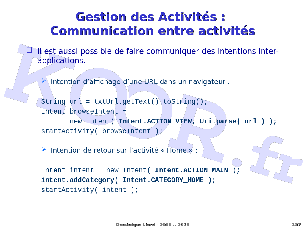 Gestion des Activités : Communication entre activités Il est aussi possible de faire communiquer des intentions inter-applications. Intention d?affichage d?une URL dans un navigateur : String url = txtUrl.getText().toString(); Intent browseIntent = new Intent( Intent.ACTION_VIEW, Uri.parse( url ) ); startActivity( browseIntent ); Intention de retour sur l?activité « Home » : Intent intent = new Intent( Intent.ACTION_MAIN ); intent.addCategory( Intent.CATEGORY_HOME ); startActivity( intent ); Dominique Liard - 2011 .. 2019