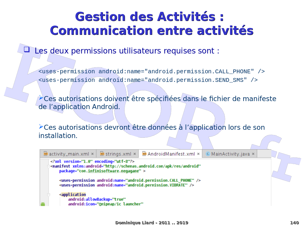 Gestion des Activités : Communication entre activités Les deux permissions utilisateurs requises sont : <uses-permission android:name="android.permission.CALL_PHONE" /> <uses-permission android:name="android.permission.SEND_SMS" /> Ces autorisations doivent être spécifiées dans le fichier de manifeste de l?application Android. Ces autorisations devront être données à l?application lors de son installation. Dominique Liard - 2011 .. 2019 Notes: