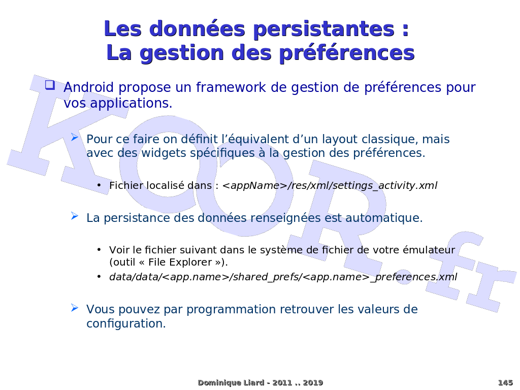 Les données persistantes : La gestion des préférences Android propose un framework de gestion de préférences pour vos applications. Pour ce faire on définit l?équivalent d?un layout classique, mais avec des widgets spécifiques à la gestion des préférences. Fichier localisé dans : <appName>/res/xml/settings_activity.xml La persistance des données renseignées est automatique. Voir le fichier suivant dans le système de fichier de votre émulateur (outil « File Explorer »). data/data/<app.name>/shared_prefs/<app.name>_preferences.xml Vous pouvez par programmation retrouver les valeurs de configuration. Dominique Liard - 2011 .. 2019