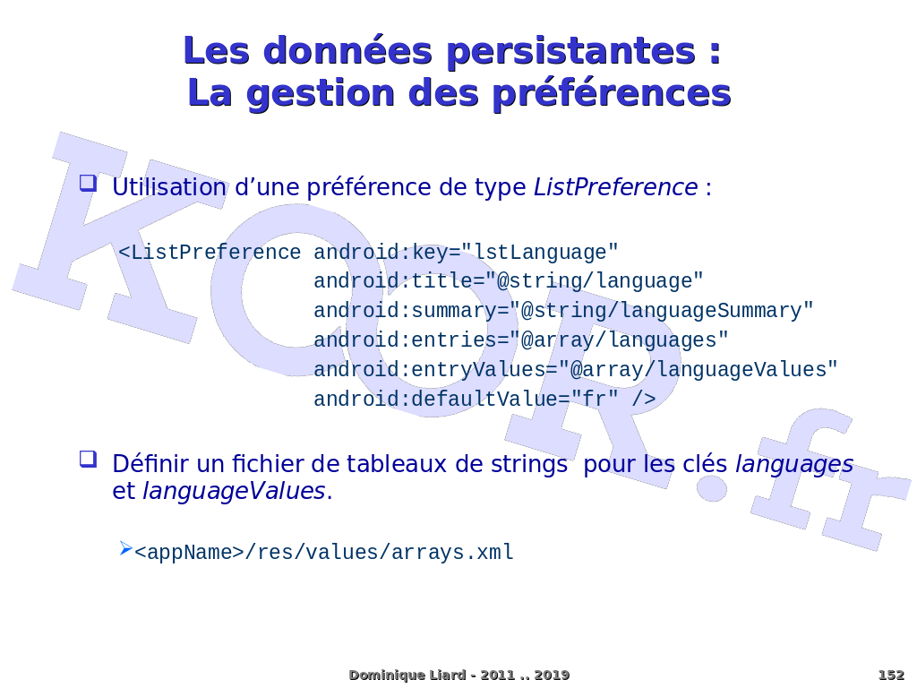Les données persistantes : La gestion des préférences Utilisation d?une préférence de type ListPreference : <ListPreference android:key="lstLanguage" android:title="@string/language" android:summary="@string/languageSummary" android:entries="@array/languages" android:entryValues="@array/languageValues" android:defaultValue="fr" /> Définir un fichier de tableaux de strings pour les clés languages et languageValues. <appName>/res/values/arrays.xml Dominique Liard - 2011 .. 2019