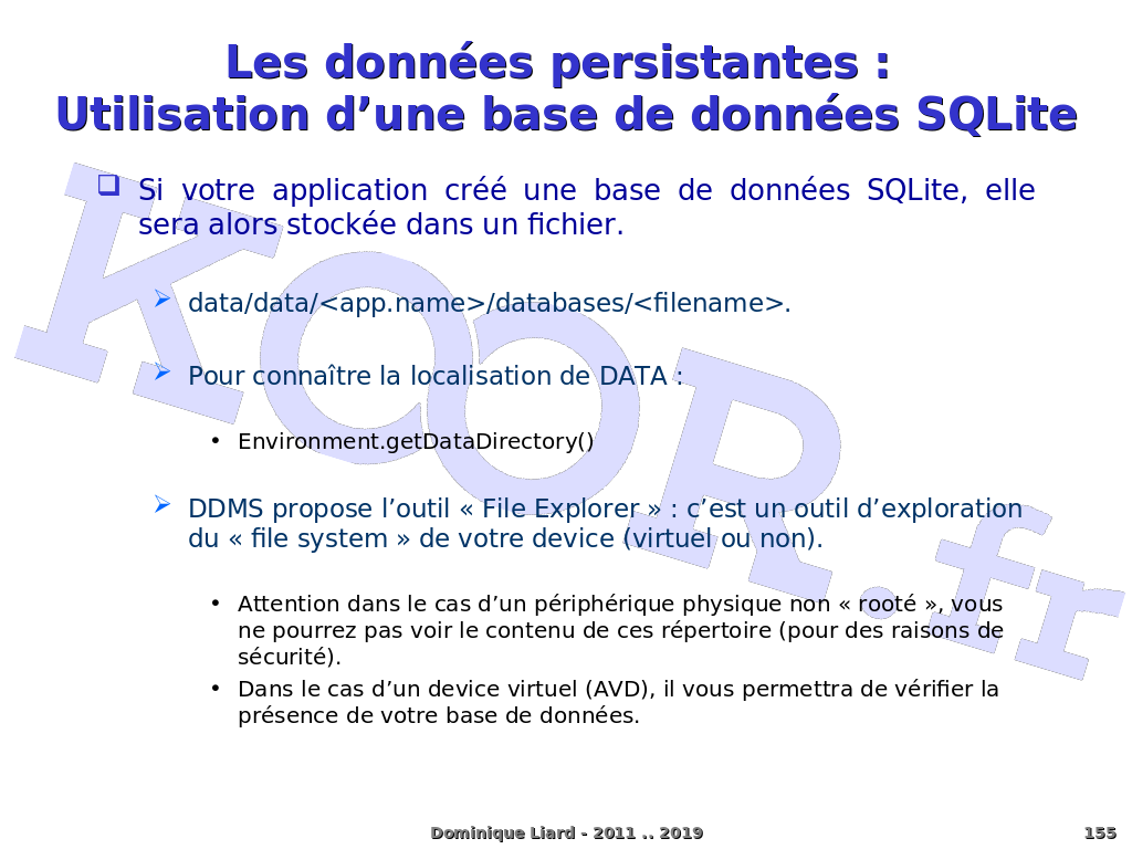 Les données persistantes : Utilisation d?une base de données SQLite Si votre application créé une base de données SQLite, elle sera alors stockée dans un fichier. data/data/<app.name>/databases/<filename>. Pour connaître la localisation de DATA : Environment.getDataDirectory() DDMS propose l?outil « File Explorer » : c?est un outil d?exploration du « file system » de votre device (virtuel ou non). Attention dans le cas d?un périphérique physique non « rooté », vous ne pourrez pas voir le contenu de ces répertoire (pour des raisons de sécurité). Dans le cas d?un device virtuel (AVD), il vous permettra de vérifier la présence de votre base de données. Dominique Liard - 2011 .. 2019
