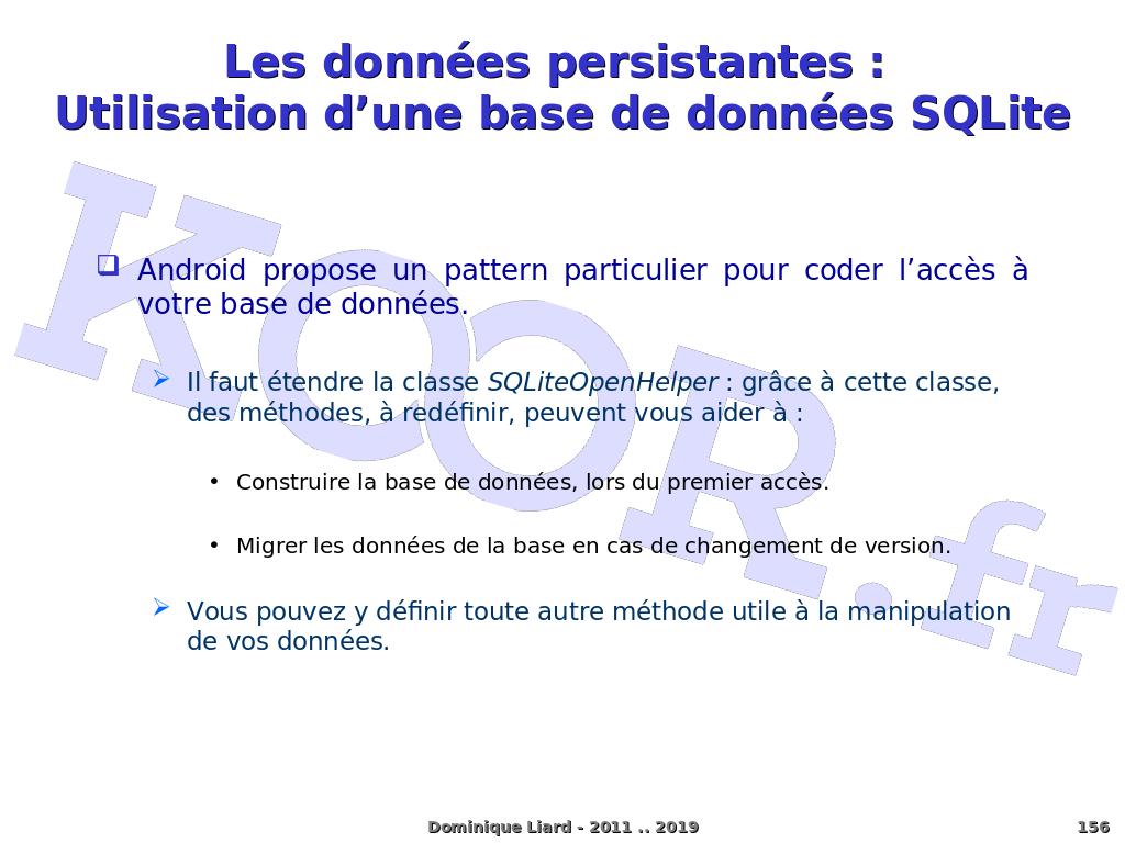 Les données persistantes : Utilisation d?une base de données SQLite Android propose un pattern particulier pour coder l?accès à votre base de données. Il faut étendre la classe SQLiteOpenHelper : grâce à cette classe, des méthodes, à redéfinir, peuvent vous aider à : Construire la base de données, lors du premier accès. Migrer les données de la base en cas de changement de version. Vous pouvez y définir toute autre méthode utile à la manipulation de vos données. Dominique Liard - 2011 .. 2019