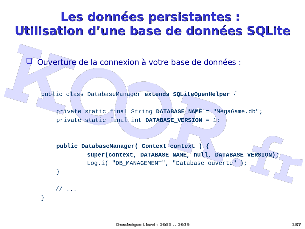 Les données persistantes : Utilisation d?une base de données SQLite Ouverture de la connexion à votre base de données : public class DatabaseManager extends SQLiteOpenHelper { private static final String DATABASE_NAME = "MegaGame.db"; private static final int DATABASE_VERSION = 1; public DatabaseManager( Context context ) { super(context, DATABASE_NAME, null, DATABASE_VERSION); Log.i( "DB_MANAGEMENT", "Database ouverte" ); } // ... } Dominique Liard - 2011 .. 2019