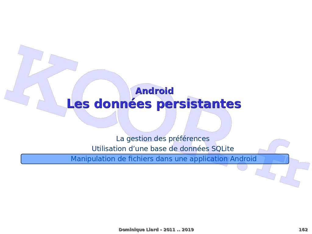 Android Les données persistantes La gestion des préférences Utilisation d?une base de données SQLite Manipulation de fichiers dans une application Android Dominique Liard - 2011 .. 2019
