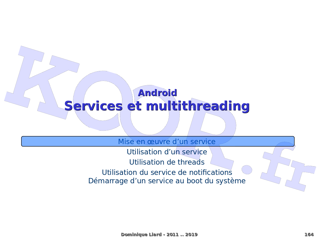 Android Services et multithreading Mise en ?uvre d?un service Utilisation d?un service Utilisation de threads Utilisation du service de notificationsDémarrage d?un service au boot du système Dominique Liard - 2011 .. 2019