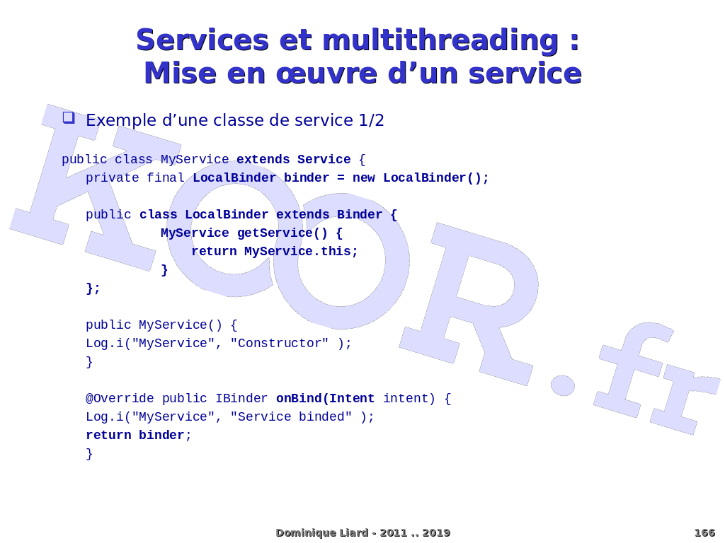 Services et multithreading : Mise en ?uvre d?un service Exemple d?une classe de service 1/2 public class MyService extends Service { private final LocalBinder binder = new LocalBinder(); public class LocalBinder extends Binder { MyService getService() { return MyService.this; } }; public MyService() { Log.i("MyService", "Constructor" ); } @Override public IBinder onBind(Intent intent) { Log.i("MyService", "Service binded" ); return binder; } Dominique Liard - 2011 .. 2019