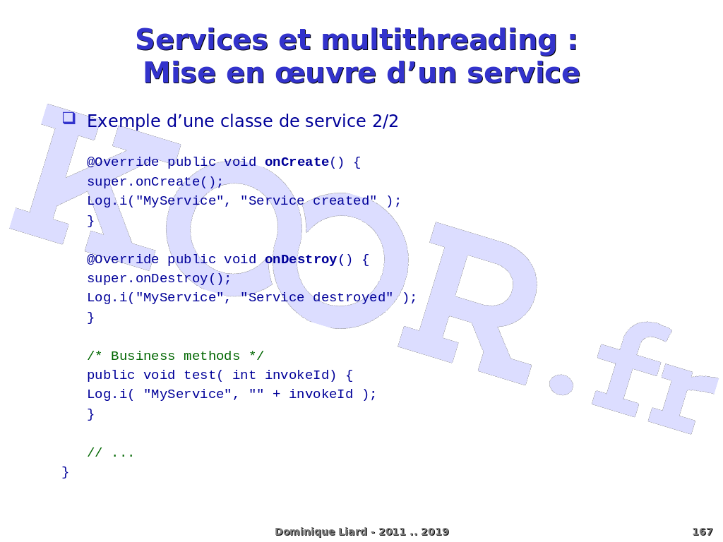 Services et multithreading : Mise en ?uvre d?un service Exemple d?une classe de service 2/2 @Override public void onCreate() { super.onCreate(); Log.i("MyService", "Service created" ); } @Override public void onDestroy() { super.onDestroy(); Log.i("MyService", "Service destroyed" ); } /* Business methods */ public void test( int invokeId) { Log.i( "MyService", "" + invokeId ); } // ... } Dominique Liard - 2011 .. 2019