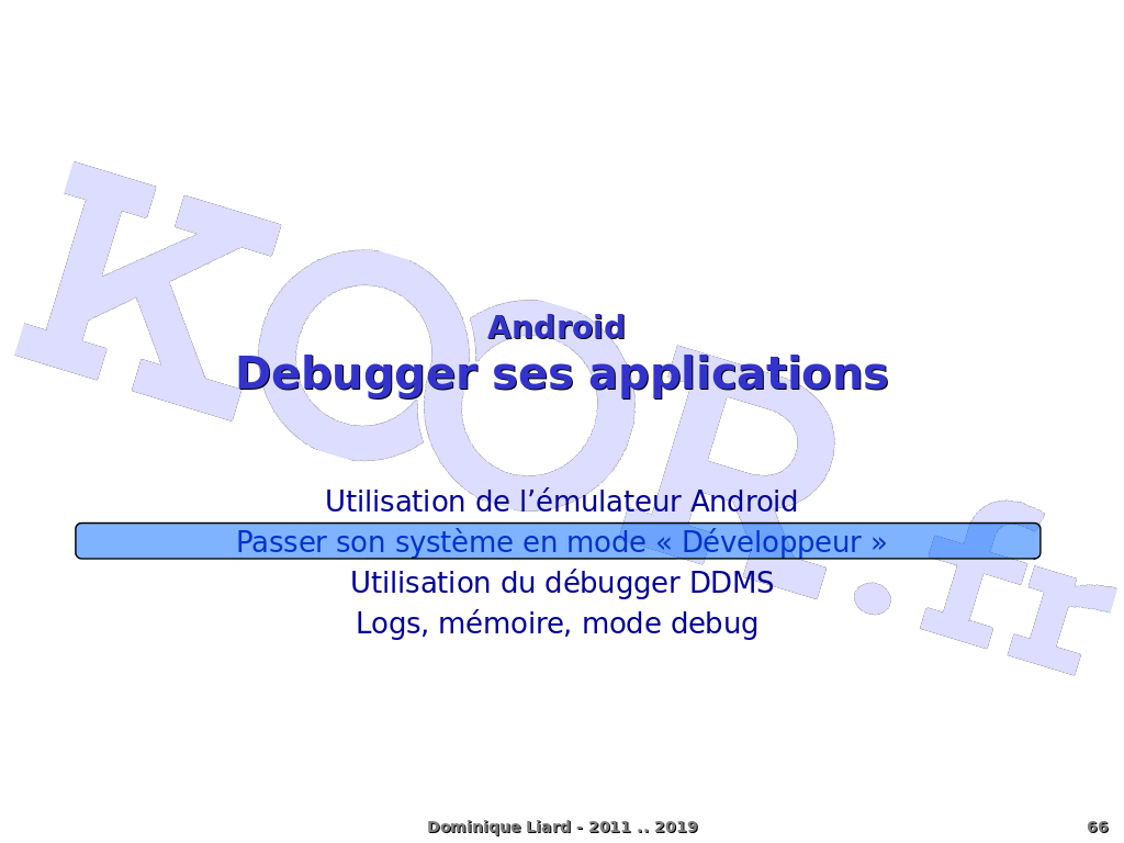 Android Debugger ses applications Utilisation de l?émulateur Android Passer son système en mode « Développeur » Utilisation du débugger DDMS Logs, mémoire, mode debug Dominique Liard - 2011 .. 2019