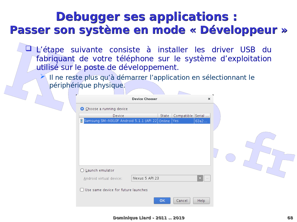Debugger ses applications : Passer son système en mode « Développeur » L?étape suivante consiste à installer les driver USB du fabriquant de votre téléphone sur le système d?exploitation utilisé sur le poste de développement. Il ne reste plus qu?à démarrer l?application en sélectionnant le périphérique physique. Dominique Liard - 2011 .. 2019