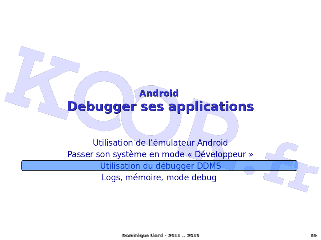 Android Debugger ses applications Utilisation de l?émulateur Android Passer son système en mode « Développeur » Utilisation du débugger DDMS Logs, mémoire, mode debug Dominique Liard - 2011 .. 2019