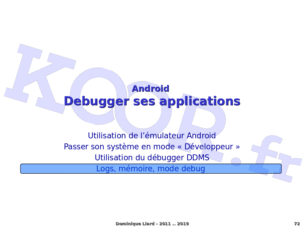 Android Debugger ses applications Utilisation de l?émulateur Android Passer son système en mode « Développeur » Utilisation du débugger DDMS Logs, mémoire, mode debug Dominique Liard - 2011 .. 2019
