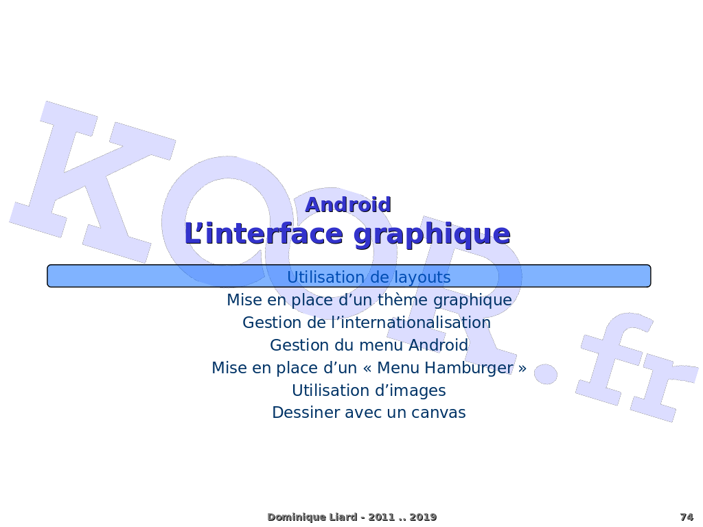 Android L?interface graphique Utilisation de layouts Mise en place d?un thème graphique Gestion de l?internationalisation Gestion du menu Android Mise en place d?un « Menu Hamburger » Utilisation d?images Dessiner avec un canvas Dominique Liard - 2011 .. 2019