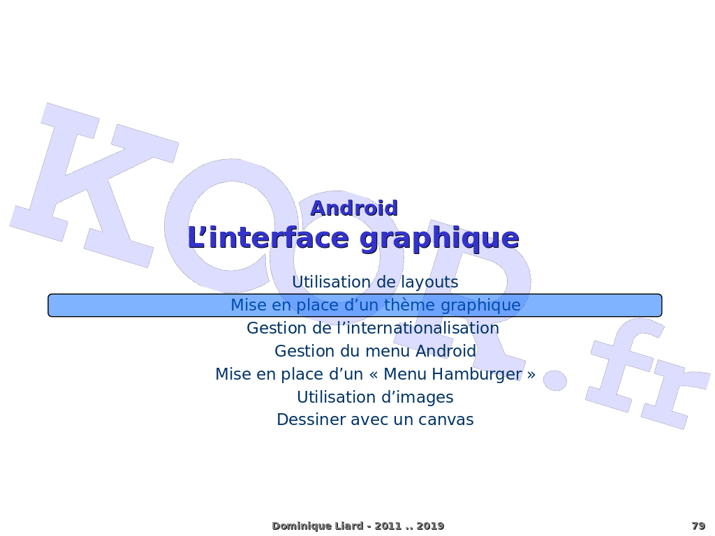 Android L?interface graphique Utilisation de layouts Mise en place d?un thème graphique Gestion de l?internationalisation Gestion du menu Android Mise en place d?un « Menu Hamburger » Utilisation d?images Dessiner avec un canvas Dominique Liard - 2011 .. 2019
