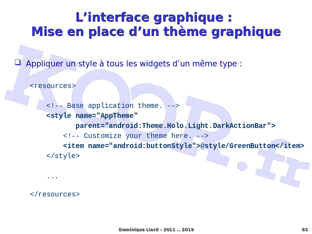 L?interface graphique : Mise en place d?un thème graphique Appliquer un style à tous les widgets d?un même type : <resources> <!-- Base application theme. --> <style name="AppTheme" parent="android:Theme.Holo.Light.DarkActionBar"> <!-- Customize your theme here. --> <item name="android:buttonStyle">@style/GreenButton</item> </style> ... </resources> Dominique Liard - 2011 .. 2019