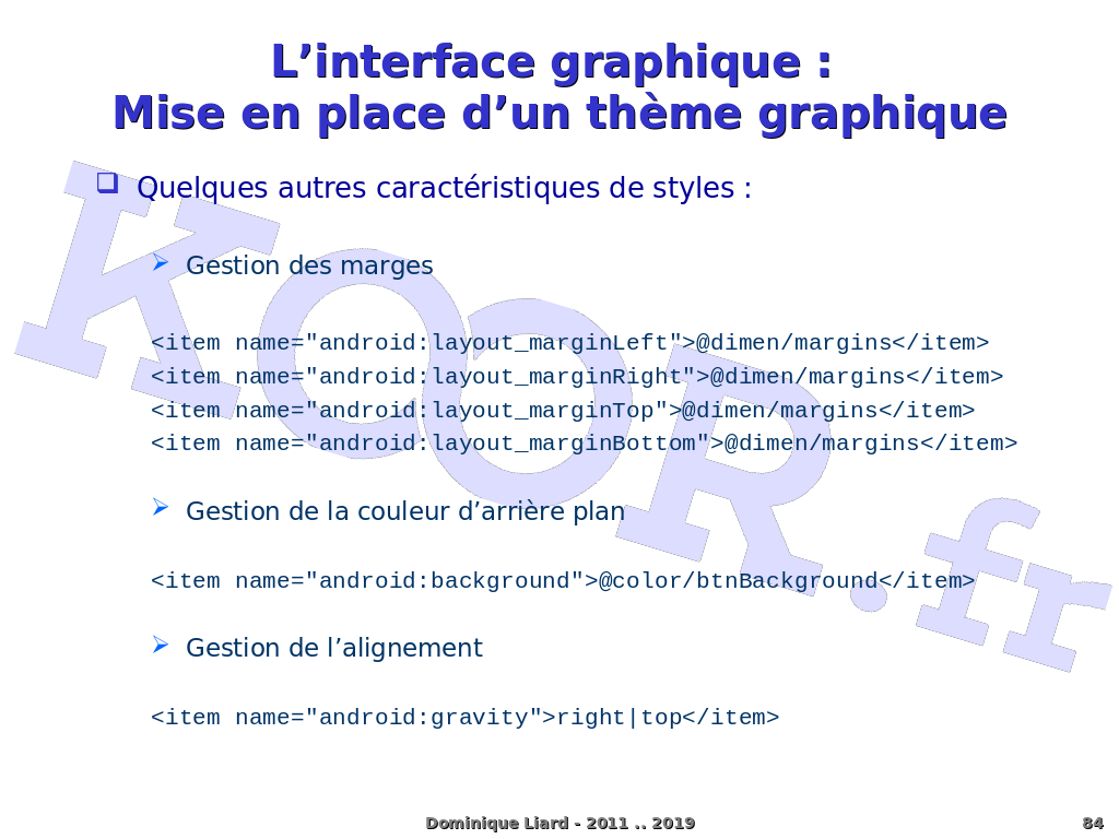 L?interface graphique : Mise en place d?un thème graphique Quelques autres caractéristiques de styles : Gestion des marges <item name="android:layout_marginLeft">@dimen/margins</item> <item name="android:layout_marginRight">@dimen/margins</item> <item name="android:layout_marginTop">@dimen/margins</item> <item name="android:layout_marginBottom">@dimen/margins</item> Gestion de la couleur d?arrière plan <item name="android:background">@color/btnBackground</item> Gestion de l?alignement <item name="android:gravity">right|top</item> Dominique Liard - 2011 .. 2019