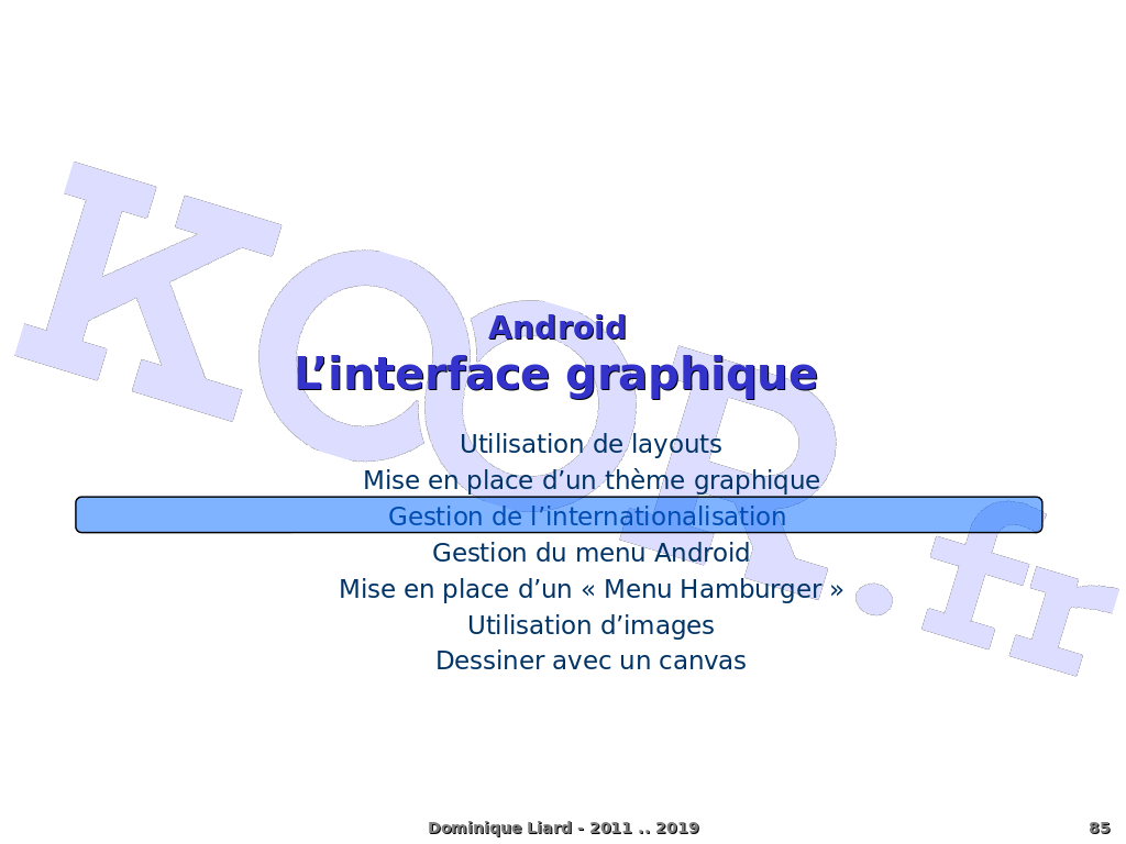 Android L?interface graphique Utilisation de layouts Mise en place d?un thème graphique Gestion de l?internationalisation Gestion du menu Android Mise en place d?un « Menu Hamburger » Utilisation d?images Dessiner avec un canvas Dominique Liard - 2011 .. 2019