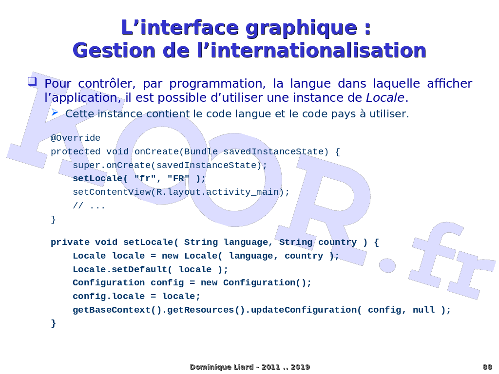L?interface graphique : Gestion de l?internationalisation Pour contrôler, par programmation, la langue dans laquelle afficher l?application, il est possible d?utiliser une instance de Locale. Cette instance contient le code langue et le code pays à utiliser. @Override protected void onCreate(Bundle savedInstanceState) { super.onCreate(savedInstanceState); setLocale( "fr", "FR" ); setContentView(R.layout.activity_main); // ... } private void setLocale( String language, String country ) { Locale locale = new Locale( language, country ); Locale.setDefault( locale ); Configuration config = new Configuration(); config.locale = locale; getBaseContext().getResources().updateConfiguration( config, null ); } Dominique Liard - 2011 .. 2019