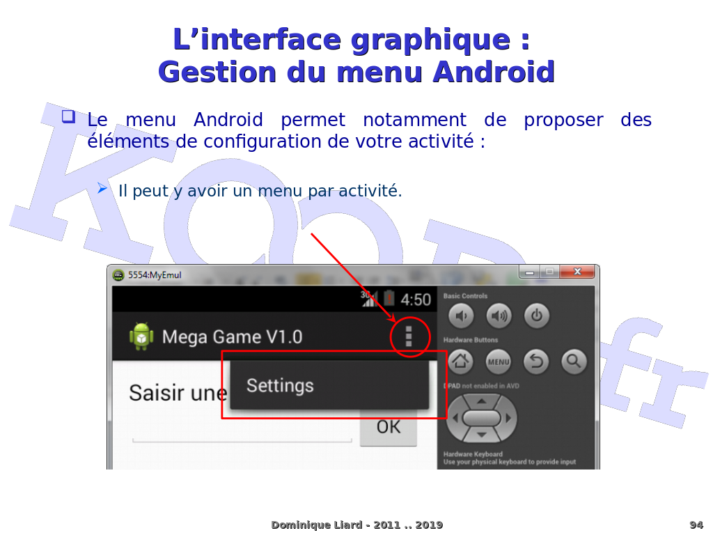 L?interface graphique : Gestion du menu Android Le menu Android permet notamment de proposer des éléments de configuration de votre activité : Il peut y avoir un menu par activité. Dominique Liard - 2011 .. 2019
