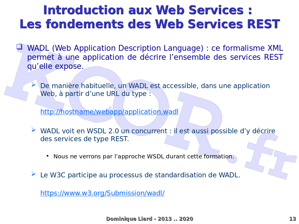 Introduction aux Web Services : Les fondements des Web Services REST WADL (Web Application Description Language) : ce formalisme XML permet à une application de décrire l?ensemble des services REST qu?elle expose. De manière habituelle, un WADL est accessible, dans une application Web, à partir d?une URL du type : http://hostname/webapp/application.wadl WADL voit en WSDL 2.0 un concurrent : il est aussi possible d?y décrire des services de type REST. Nous ne verrons par l?approche WSDL durant cette formation. Le W3C participe au processus de standardisation de WADL. https://www.w3.org/Submission/wadl/ Dominique Liard - 2013 .. 2020