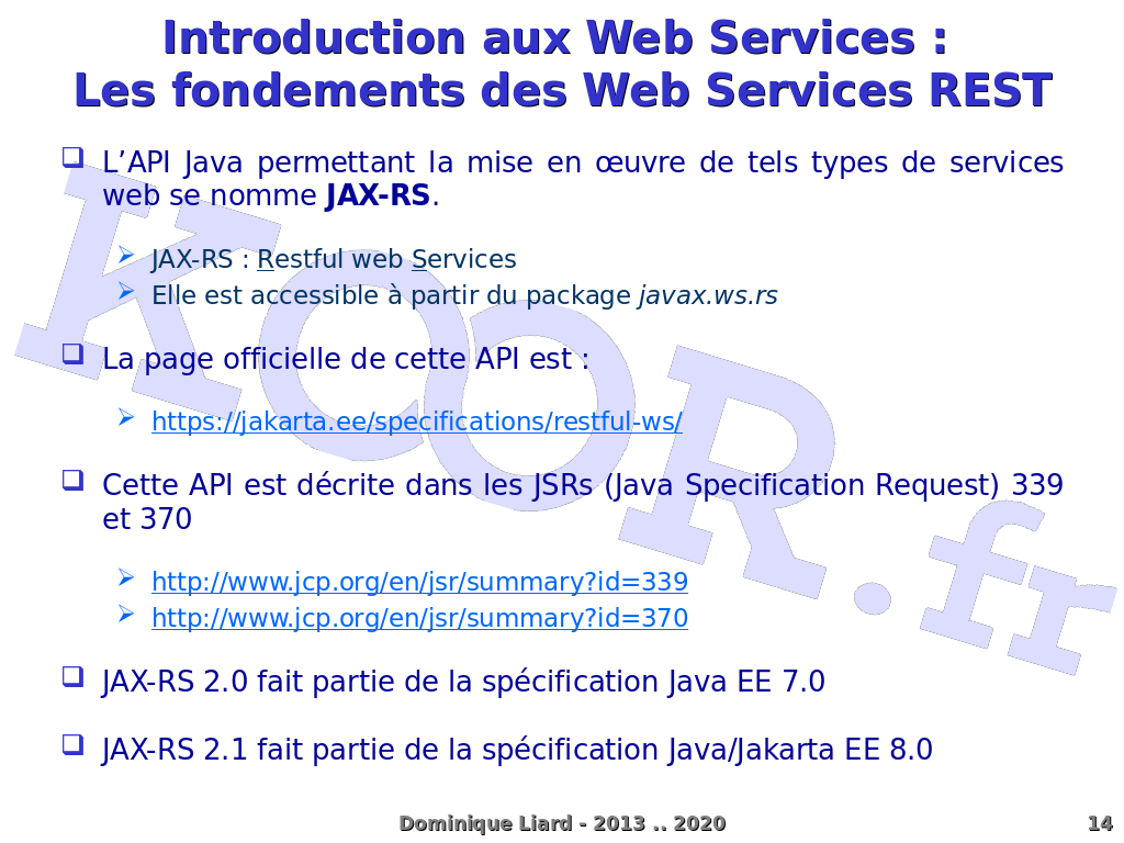 Introduction aux Web Services : Les fondements des Web Services REST L?API Java permettant la mise en ?uvre de tels types de services web se nomme JAX-RS. JAX-RS : Restful web Services Elle est accessible à partir du package javax.ws.rs La page officielle de cette API est : Cette API est décrite dans les JSRs (Java Specification Request) 339 et 370 JAX-RS 2.0 fait partie de la spécification Java EE 7.0 JAX-RS 2.1 fait partie de la spécification Java/Jakarta EE 8.0 Dominique Liard - 2013 .. 2020