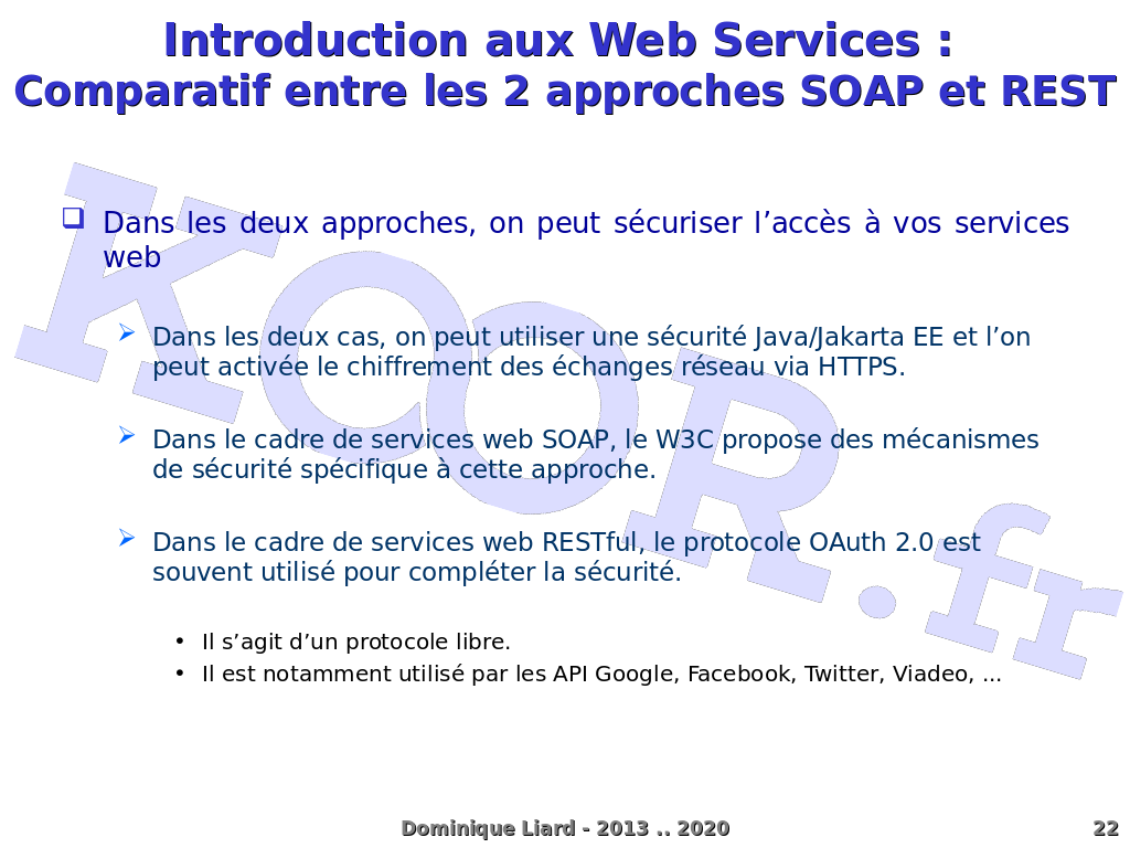 Introduction aux Web Services : Comparatif entre les 2 approches SOAP et REST Dans les deux approches, on peut sécuriser l?accès à vos services web Dans les deux cas, on peut utiliser une sécurité Java/Jakarta EE et l?on peut activée le chiffrement des échanges réseau via HTTPS. Dans le cadre de services web SOAP, le W3C propose des mécanismes de sécurité spécifique à cette approche. Dans le cadre de services web RESTful, le protocole OAuth 2.0 est souvent utilisé pour compléter la sécurité. Il s?agit d?un protocole libre. Il est notamment utilisé par les API Google, Facebook, Twitter, Viadeo, ... Dominique Liard - 2013 .. 2020