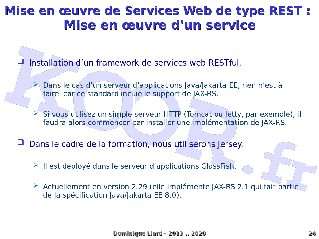 Mise en ?uvre de Services Web de type REST : Mise en ?uvre d'un service Installation d?un framework de services web RESTful. Dans le cas d?un serveur d?applications Java/Jakarta EE, rien n?est à faire, car ce standard inclue le support de JAX-RS. Si vous utilisez un simple serveur HTTP (Tomcat ou Jetty, par exemple), il faudra alors commencer par installer une implémentation de JAX-RS. Dans le cadre de la formation, nous utiliserons Jersey. Il est déployé dans le serveur d?applications GlassFish. Actuellement en version 2.29 (elle implémente JAX-RS 2.1 qui fait partie de la spécification Java/Jakarta EE 8.0). Dominique Liard - 2013 .. 2020