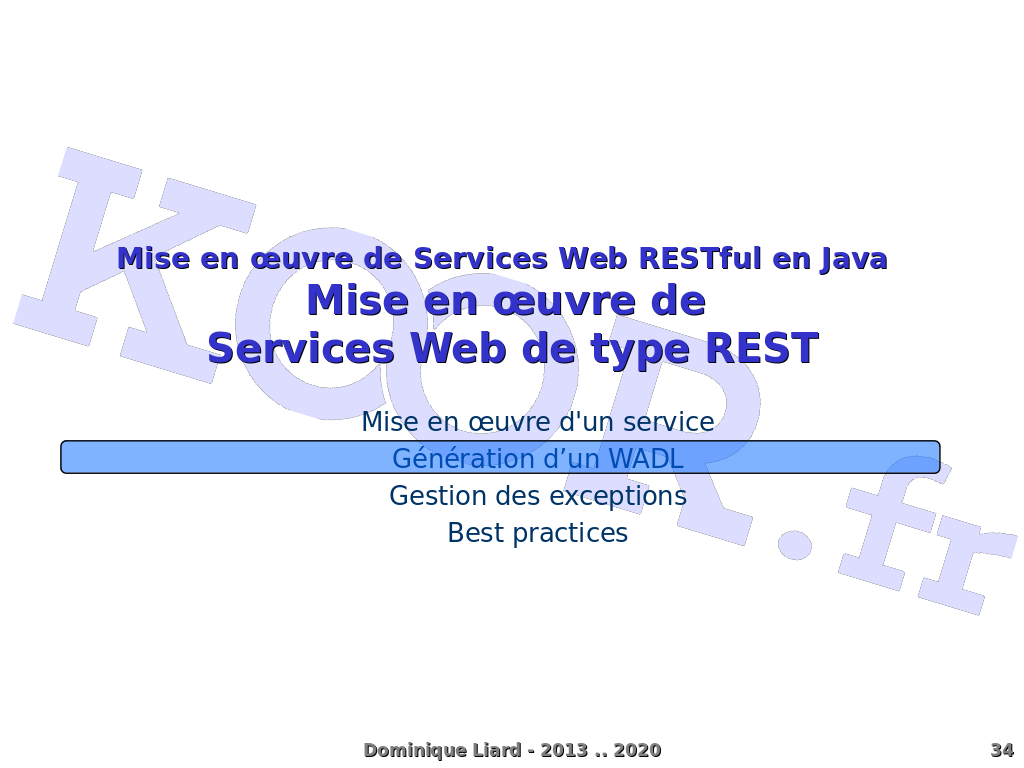 Mise en ?uvre de Services Web RESTful en Java Mise en ?uvre de Services Web de type REST Mise en ?uvre d'un service Génération d?un WADL Gestion des exceptions Best practices Dominique Liard - 2013 .. 2020