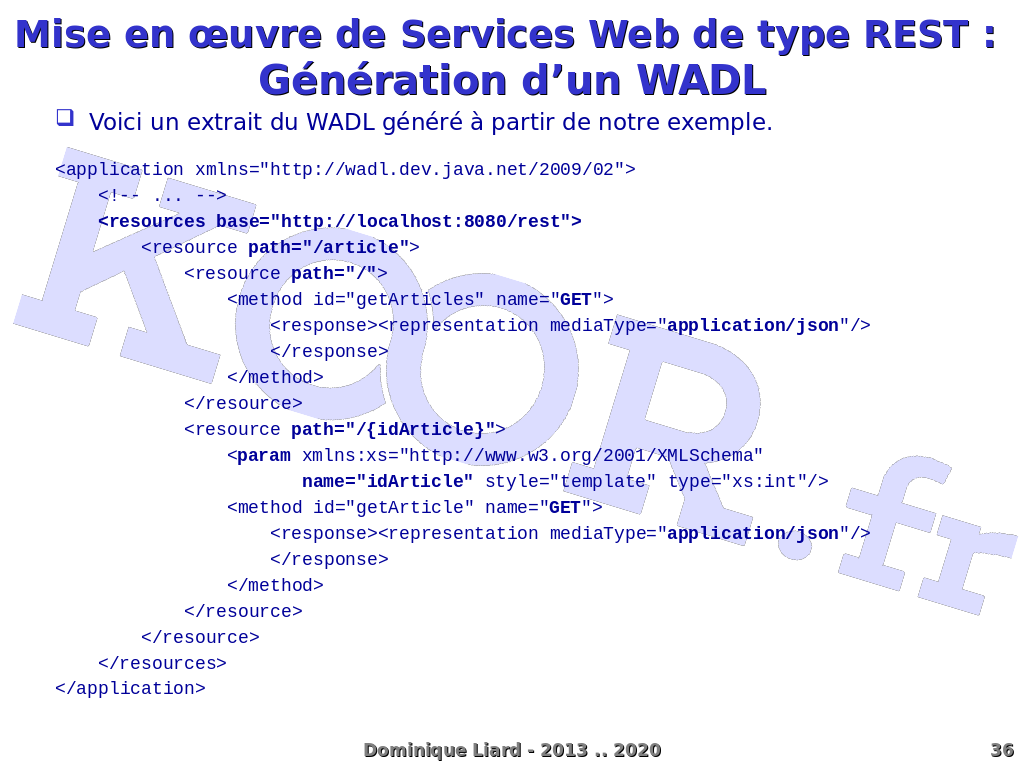 Mise en ?uvre de Services Web de type REST : Génération d?un WADL Voici un extrait du WADL généré à partir de notre exemple. <application xmlns="http://wadl.dev.java.net/2009/02"> <!-- ... --> <resources base="http://localhost:8080/rest"> <resource path="/article"> <resource path="/"> <method id="getArticles" name="GET"> <response><representation mediaType="application/json"/> </response> </method> </resource> <resource path="/{idArticle}"> <param xmlns:xs="http://www.w3.org/2001/XMLSchema" name="idArticle" style="template" type="xs:int"/> <method id="getArticle" name="GET"> <response><representation mediaType="application/json"/> </response> </method> </resource> </resource> </resources> </application> Dominique Liard - 2013 .. 2020