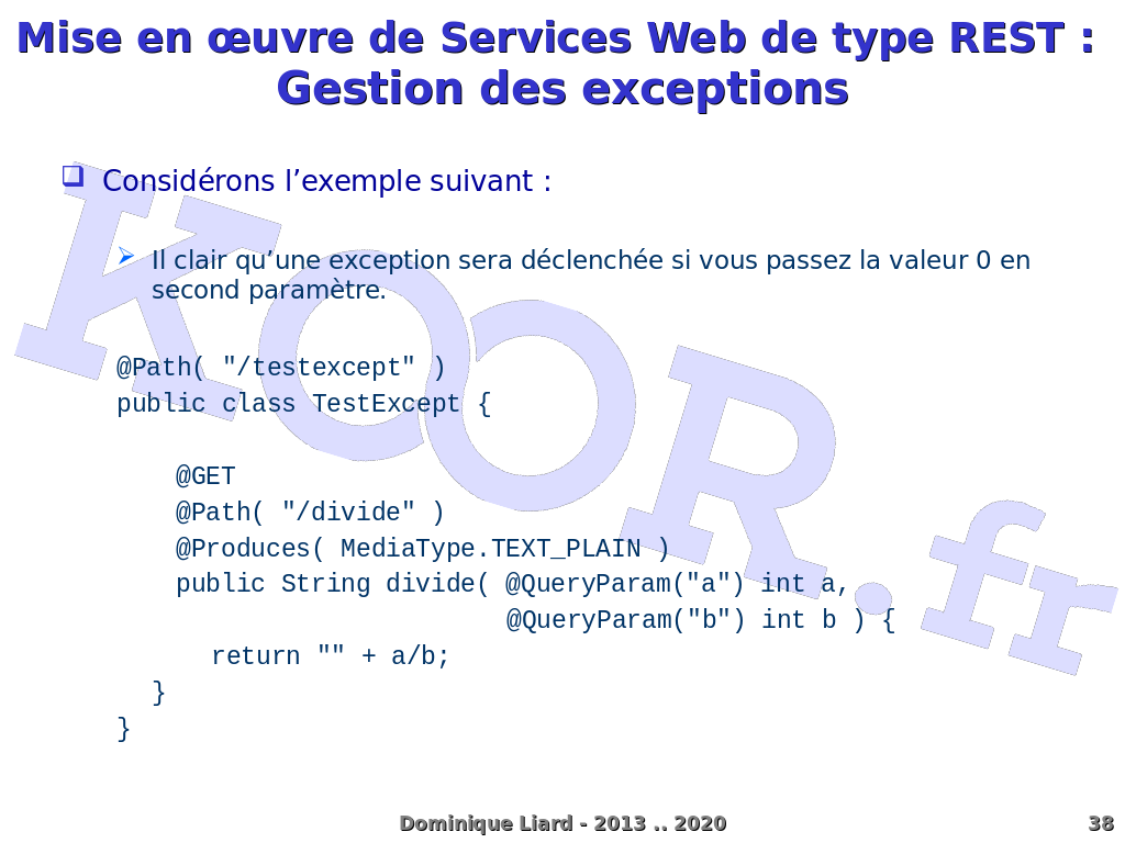 Mise en ?uvre de Services Web de type REST : Gestion des exceptions Considérons l?exemple suivant : Il clair qu?une exception sera déclenchée si vous passez la valeur 0 en second paramètre. @Path( "/testexcept" ) public class TestExcept { @GET @Path( "/divide" ) @Produces( MediaType.TEXT_PLAIN ) public String divide( @QueryParam("a") int a, @QueryParam("b") int b ) { return "" + a/b; } } Dominique Liard - 2013 .. 2020