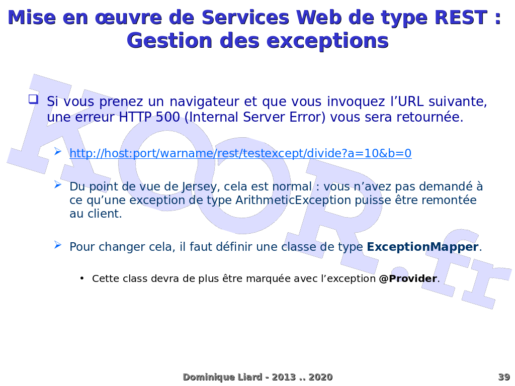 Mise en ?uvre de Services Web de type REST : Gestion des exceptions Si vous prenez un navigateur et que vous invoquez l?URL suivante, une erreur HTTP 500 (Internal Server Error) vous sera retournée. http://host:port/warname/rest/testexcept/divide?a=10&b=0 Du point de vue de Jersey, cela est normal : vous n?avez pas demandé à ce qu?une exception de type ArithmeticException puisse être remontée au client. Pour changer cela, il faut définir une classe de type ExceptionMapper. Cette class devra de plus être marquée avec l?exception @Provider. Dominique Liard - 2013 .. 2020