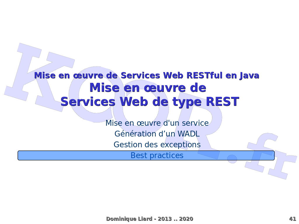 Mise en ?uvre de Services Web RESTful en Java Mise en ?uvre de Services Web de type REST Mise en ?uvre d'un service Génération d?un WADL Gestion des exceptions Best practices Dominique Liard - 2013 .. 2020