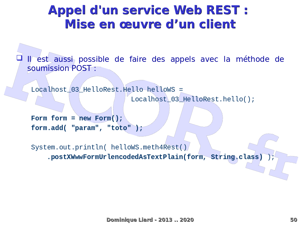 Appel d'un service Web REST : Mise en ?uvre d?un client Il est aussi possible de faire des appels avec la méthode de soumission POST : Localhost_03_HelloRest.Hello helloWS = Localhost_03_HelloRest.hello(); Form form = new Form(); form.add( "param", "toto" ); System.out.println( helloWS.meth4Rest() .postXWwwFormUrlencodedAsTextPlain(form, String.class) ); Dominique Liard - 2013 .. 2020