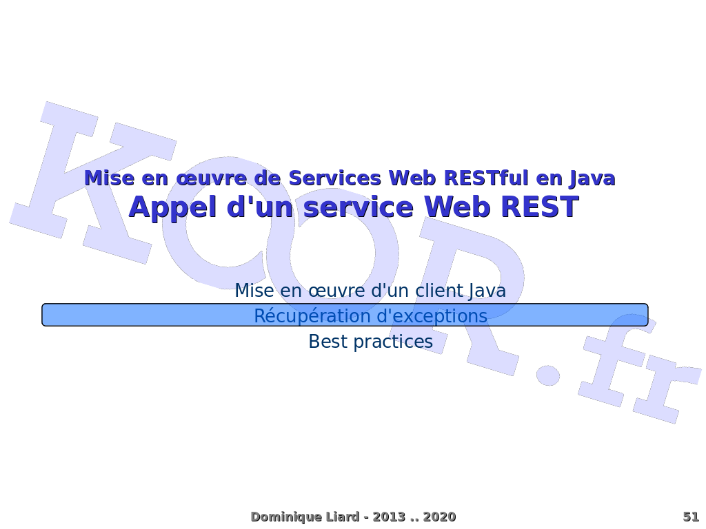 Mise en ?uvre de Services Web RESTful en Java Appel d'un service Web REST Mise en ?uvre d'un client Java Récupération d'exceptions Best practices Dominique Liard - 2013 .. 2020