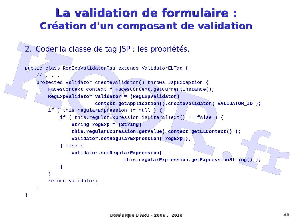 La validation de formulaire :Création d'un composant de validation Coder la classe de tag JSP : les propriétés. public class RegExpValidatorTag extends ValidatorELTag { // . . . protected Validator createValidator() throws JspException { FacesContext context = FacesContext.getCurrentInstance(); RegExpValidator validator = (RegExpValidator) context.getApplication().createValidator( VALIDATOR_ID ); if ( this.regularExpression != null ) { if ( this.regularExpression.isLiteralText() == false ) { String regExp = (String) this.regularExpression.getValue( context.getELContext() ); validator.setRegularExpression( regExp ); } else { validator.setRegularExpression( this.regularExpression.getExpressionString() ); } } return validator; } } Dominique LIARD - 2006 .. 2018
