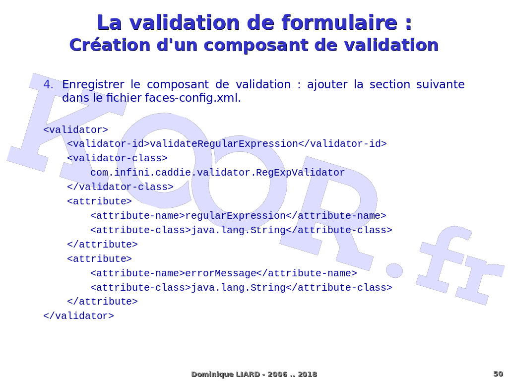 La validation de formulaire :Création d'un composant de validation Enregistrer le composant de validation : ajouter la section suivante dans le fichier faces-config.xml. <validator> <validator-id>validateRegularExpression</validator-id> <validator-class> com.infini.caddie.validator.RegExpValidator </validator-class> <attribute> <attribute-name>regularExpression</attribute-name> <attribute-class>java.lang.String</attribute-class> </attribute> <attribute> <attribute-name>errorMessage</attribute-name> <attribute-class>java.lang.String</attribute-class> </attribute> </validator> Dominique LIARD - 2006 .. 2018