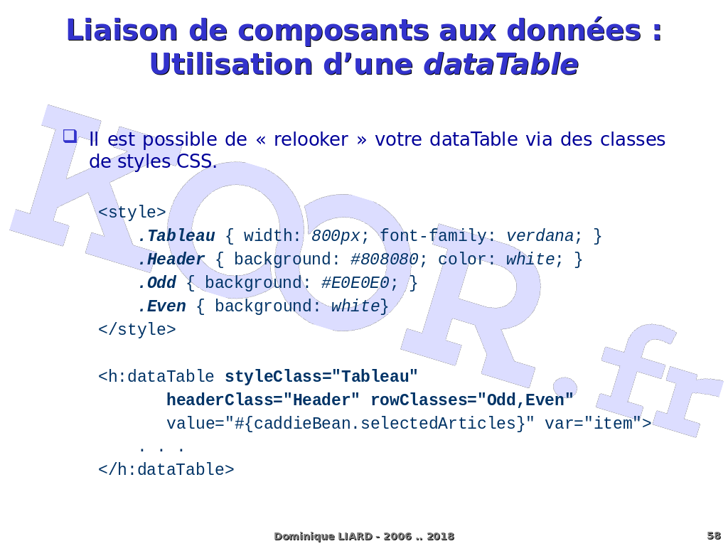 Liaison de composants aux données :Utilisation d?une dataTable Il est possible de « relooker » votre dataTable via des classes de styles CSS. <style> .Tableau { width: 800px; font-family: verdana; } .Header { background: #808080; color: white; } .Odd { background: #E0E0E0; } .Even { background: white} </style> <h:dataTable styleClass="Tableau" headerClass="Header" rowClasses="Odd,Even" value="#{caddieBean.selectedArticles}" var="item"> . . . </h:dataTable> Dominique LIARD - 2006 .. 2018 Notes: rowClasses : définis une liste de classes CSS (séparées par des ,) à appliquer cycliquement sur les données.
